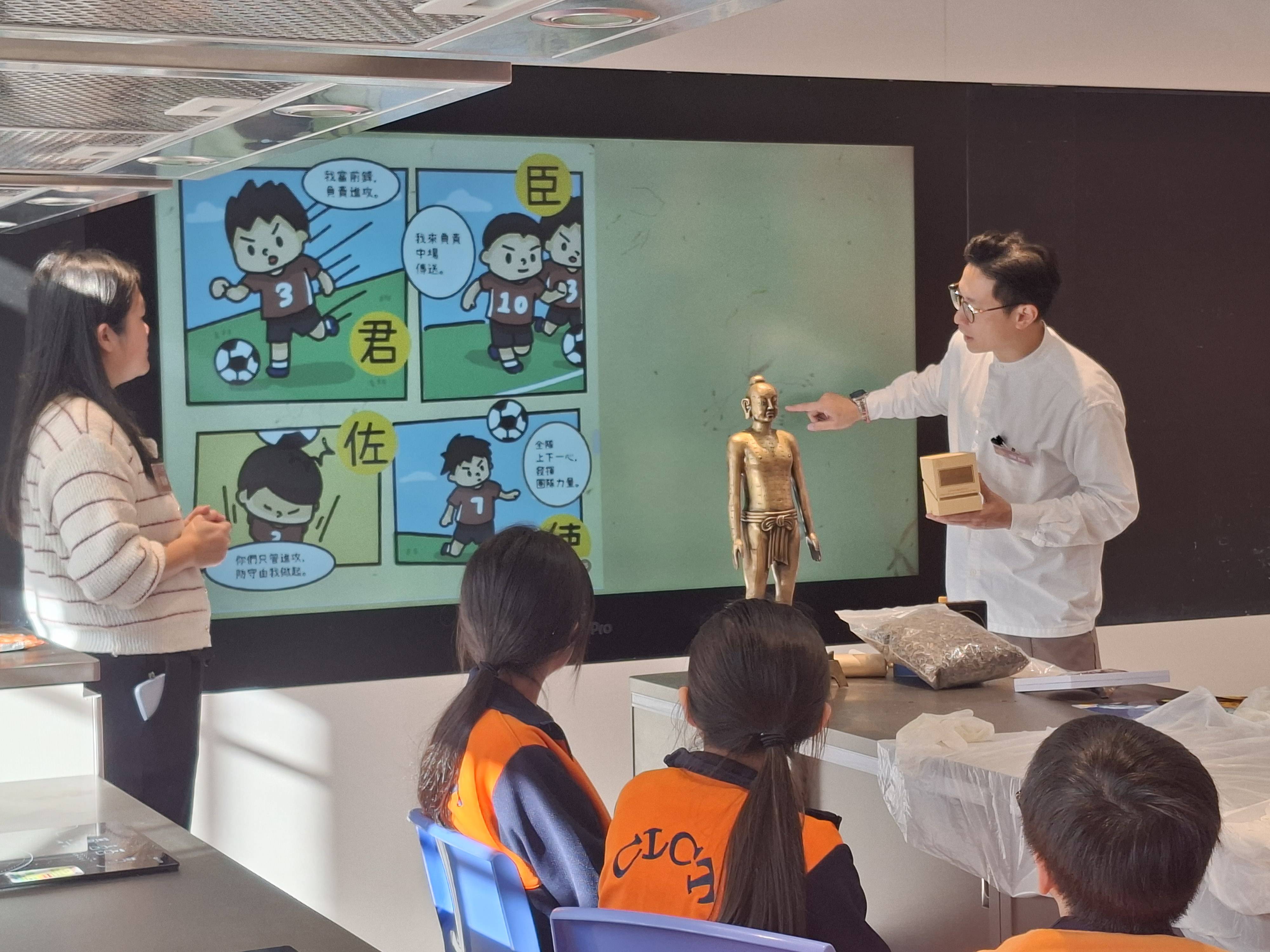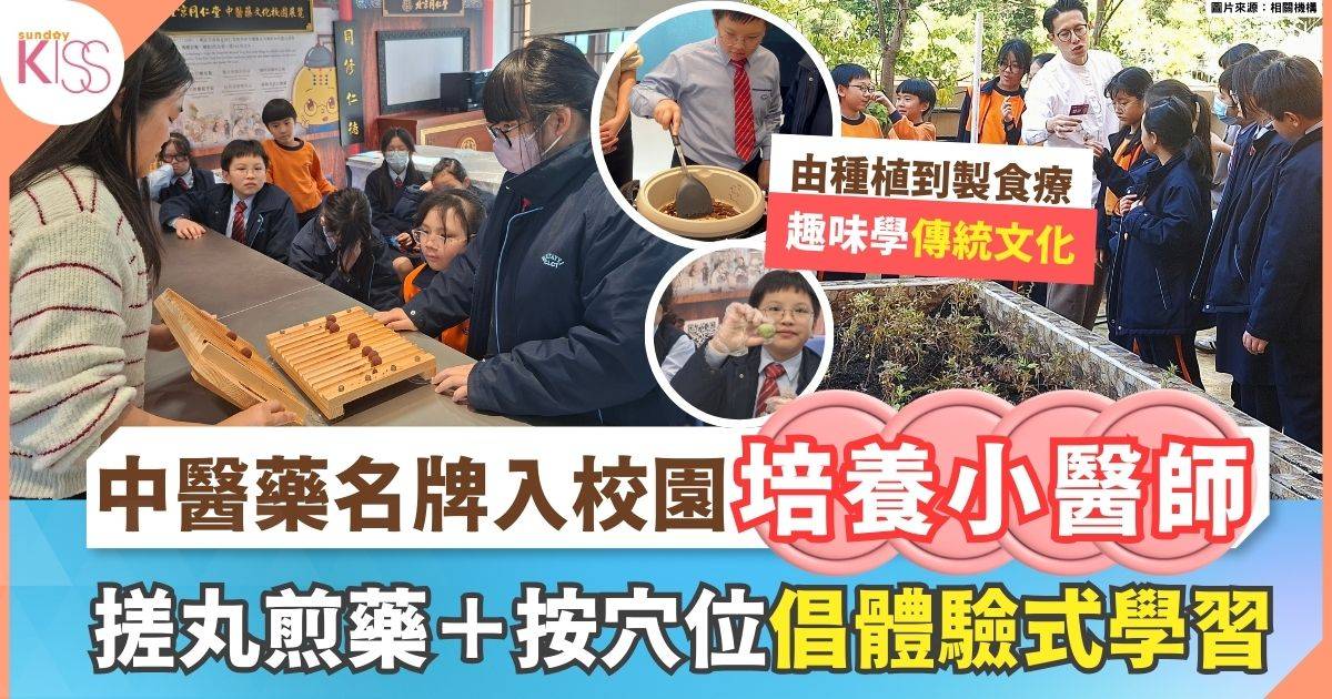 課程特別以貼近生活的方式切入,例如從時下流行的「頭頂比心」打卡動作,引導他們認識「百會穴」位置,再配合中藥秤和遊醫藥鈴等實物,讓學生邊玩邊學。又透過「病入膏肓」和「杯弓蛇影」等中文科成語故事,解釋「治未病」和「情志調節」等概念。而「二十四節氣」、「不時不食」等理論,以及食養藥膳宜忌守則,能讓學生明白為何媽媽要他們按時令喝涼茶湯水,慢慢把中醫草本元素自然融入個人和家庭生活。