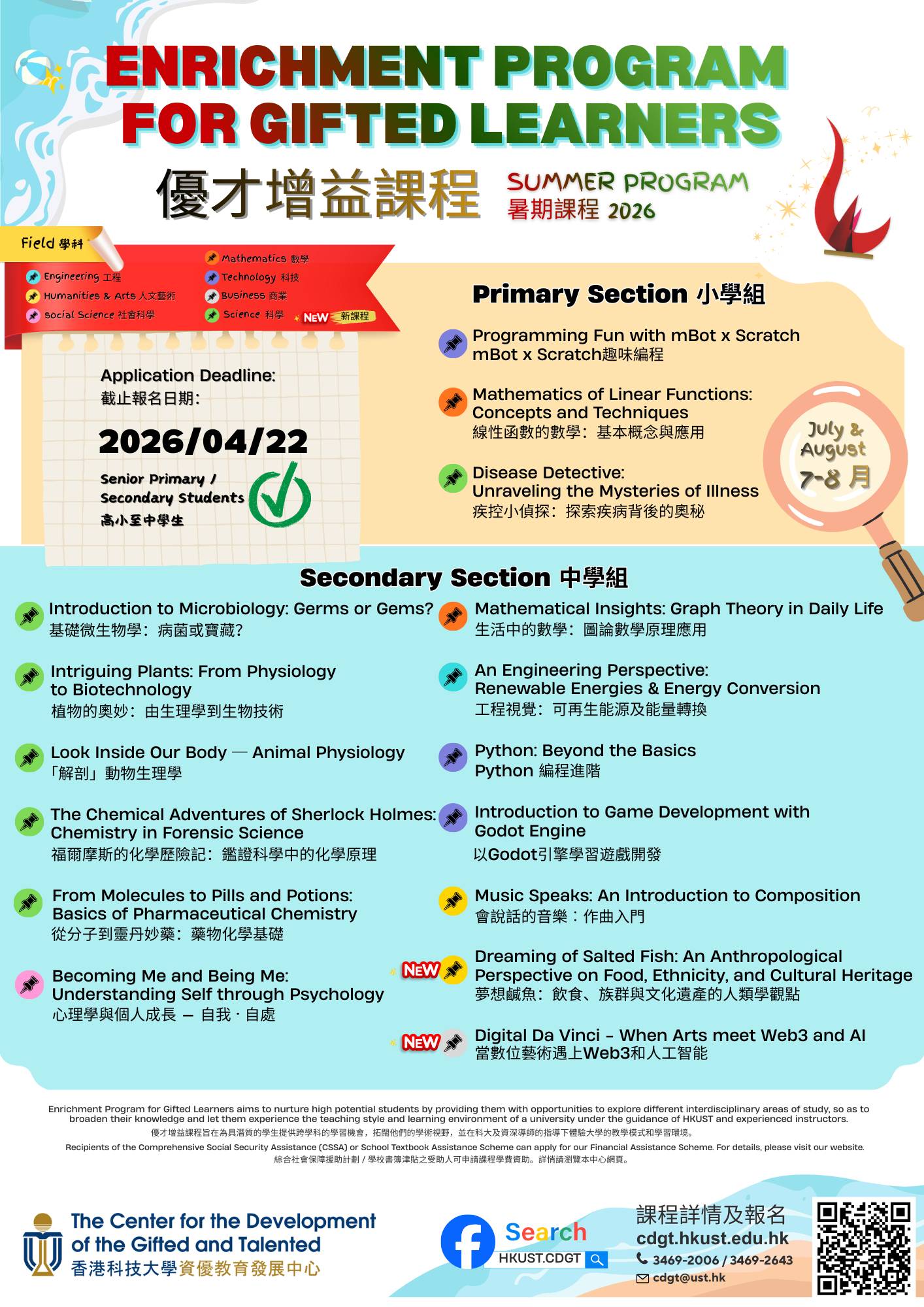 這是科大資優教育發展中心專為高小至中學生設計的重點暑期活動。課程為期數天至數星期,涵蓋16個跨學科領域,包括: