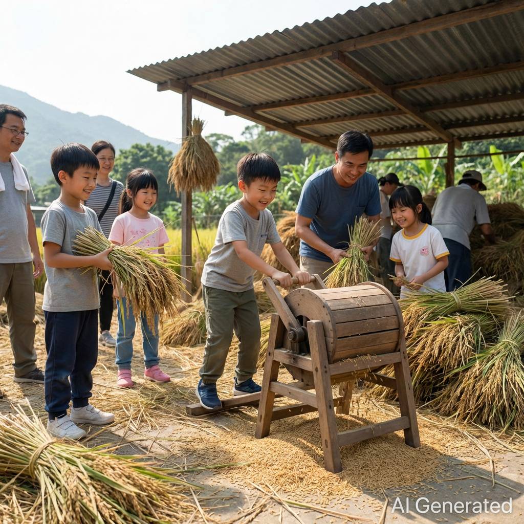 收割課程同樣精彩豐富,參加者會使用鐮刀進行稻米收割,家長需要陪同協助確保安全。收割後,孩子們會體驗稻米打殼和磨米的過程,了解從稻穀變成白米的步驟。每位小朋友更可獲得一袋自己種植的稻米帶回家品嚐,重量會視乎實際收成而定。